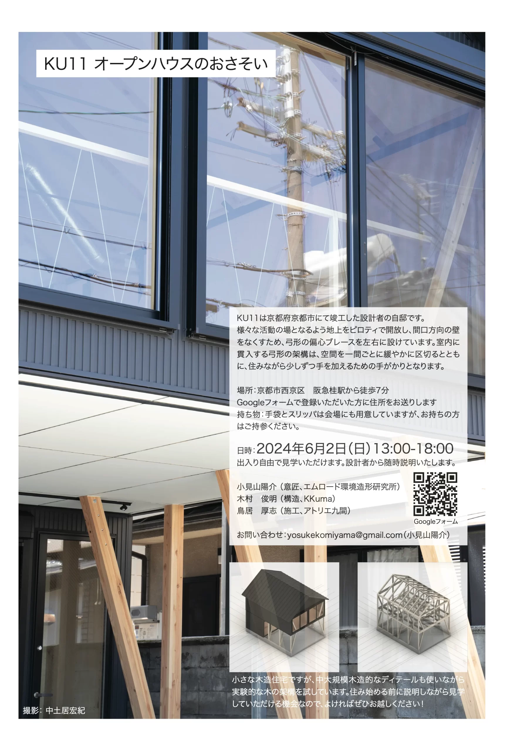 小見山が設計した小さな住宅(自邸)の竣工見学会です。様々な活動の場となる間口5.46mのピロティを弓形の偏心ブレースが支え、1-2階で室内に貫入する木の架構は住みながら少しずつ手を加えるための手がかりとなります。木造住宅の標準的な部材断面を使いつつ、特徴的な構造形式で無柱のスパンを実現しました。小さな木造住宅ですが、中大規模木造的なディテールも使いながら実験的な木の架構を試しています。住み始める前に説明しながら見学していただける機会なので、よければぜひお越しください!