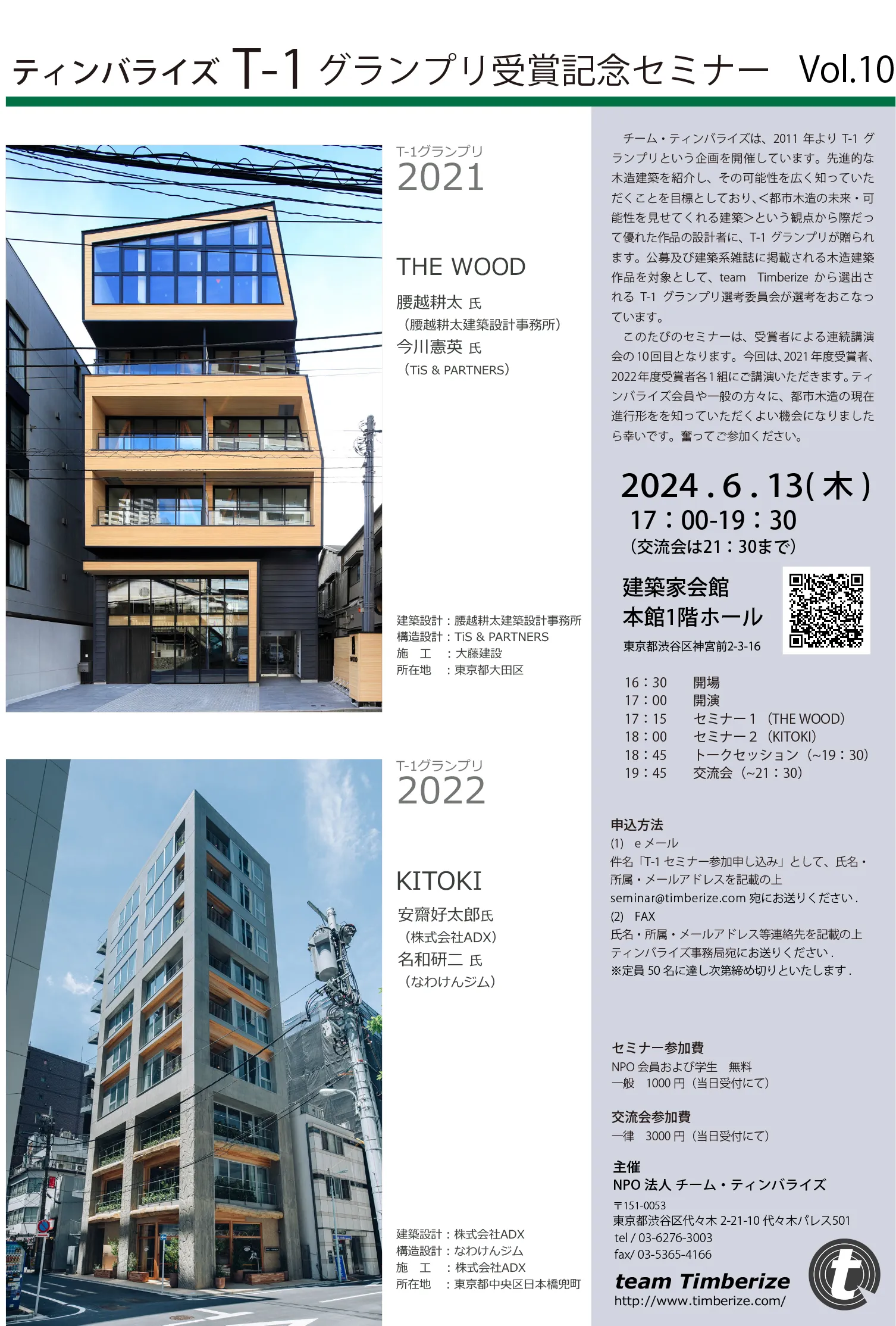 このたびのセミナーは、受賞された方々による連続講演会の10回目となります。今回は2021年度の受賞者、2022年度の受賞者の各1組にご講演いただきます。ティンバライズ会員や一般の方々に、先進的木造建築の現在進行形を知っていただくよい機会になれば幸いです。奮ってご参加ください!