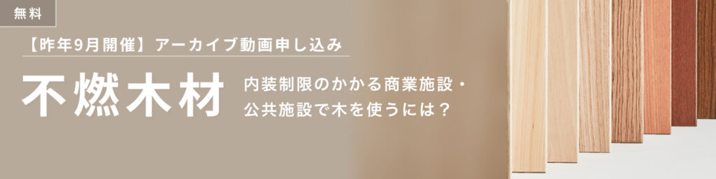 本セミナーは、昨年9月に開催させていただいた【eTREEオンライン説明会】不燃木材_内装制限のかかる商業施設・公共施設で木を使うには?の続編にあたり、より具体的な事例に踏み込んだ内容となっています。「不燃の定義や基本的な使用方法を改めて整理する」といった、導入的な内容をご確認いただきたい方はこちらをお申し込みください。