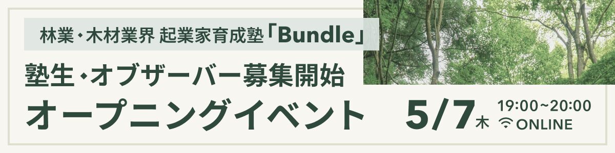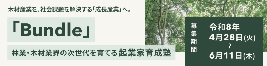 日本木材青壮年団体連合会(会長:田口 房国、スタートアップ委員会/委員長:浅野純平)は、林業・木材業界における次世代の担い手育成と、会員・地域を越えた連携の創出を目的として、起業家育成塾『Bundle』を実施いたします。
