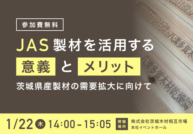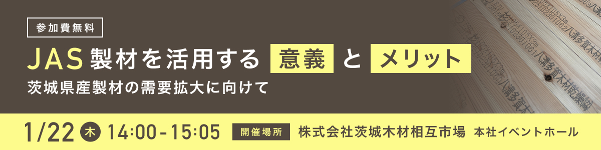 本セミナーでは、JAS製材を設計に組み込む意義、使用するメリット、性能の読み解き方、実務での活用ポイントを分かりやすく解説、茨城県産材JAS製材の魅力をお伝えします。