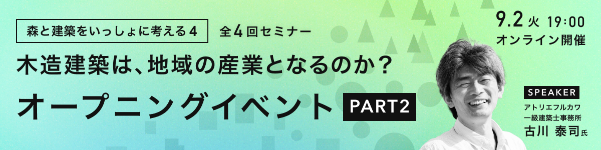オープニングイベントでは、アトリエフルカ一級建築士事務所の古川泰司氏をスピーカーにお招きして、セミナー開催の背景や各回の見どころついてお話しいただきます。