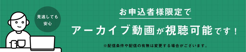 eTREEが開催するオンラインイベントの一部では、お申込みいただくことで、後日アーカイブ動画が視聴いただけます。当日視聴できるかわからない方や、急遽視聴できなくなった方もぜひ、お申込みいただければと思います。
