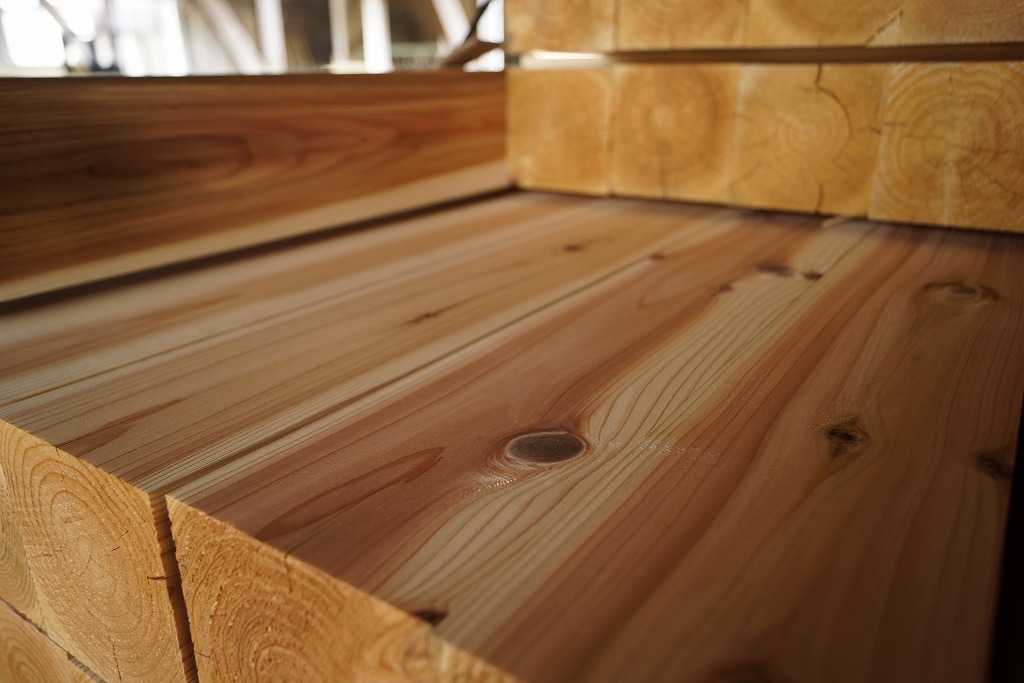 材としても、特徴のある取り組みを行っています。例えば、スギの自然乾燥です。一般的な人工乾燥だと木材にダメージが残りやすいため、伐採した木を2〜4か月山に置いたまま葉枯らし乾燥させ、製材後も2〜6か月倉庫で自然乾燥期間を取ります。また、シイタケ栽培用の広葉樹を建材として活用する取り組みもあります。シイタケ原木としての適期を過ぎた広葉樹は、大きすぎたり、重くなり、栽培現場では扱いにくい。そこで有効な活用方法として、NGO機関などの協力を得て建築内装材や家具の商品開発を行う「どんぐり材プロジェクト」がスタートしました。「FSCとの出会い」―「FSCを活用した取り組み」―「生産する材」まであらゆる部分に光るユニークさが特徴です。