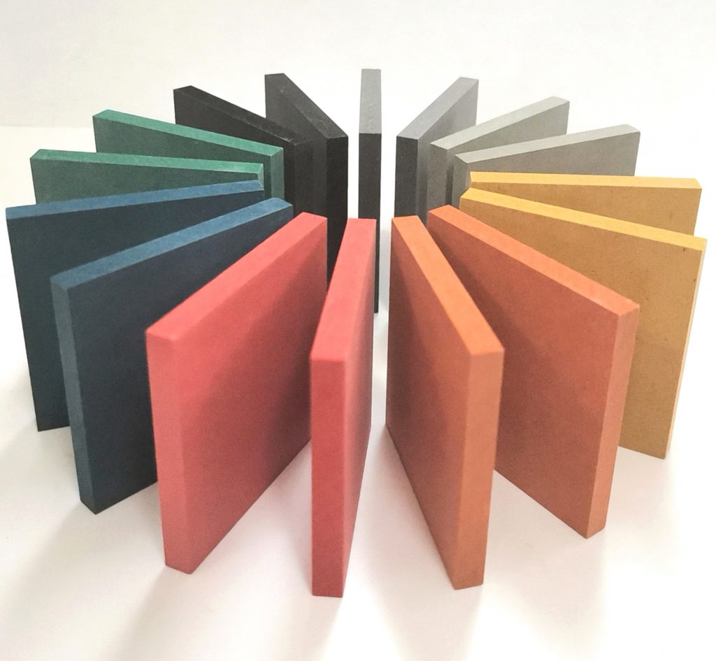 FSC認証材は、合板や主力製品のカラーMDFにも使われています。通常のMDFとは異なり木材繊維をあらかじめ染色してプレスしたカラーMDFは、断面と表面の色を合わせることができ、色ムラもなく美しい仕上がりとなります。この見た目に惹かれ、なおかつFSCにも対応できるということから、2019年に取り扱いを始めました。5mm、9mm、18mmの厚さを取り揃えており、設計士の方々が自由な企画で用いることのできる材となっています。カラーMDFにはFSCのミックスクレジットがつきますが、さらに一歩進んだFSCへのこだわりを持つ方には、FSC100%の合板を提供することもできます。