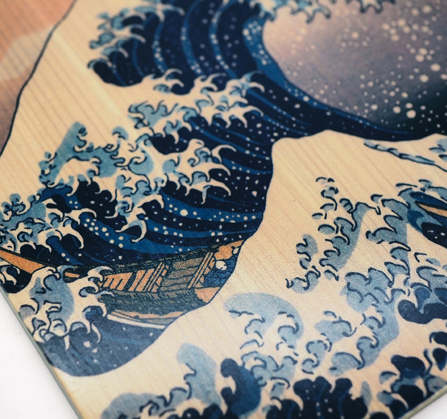 きえすぎくんに浮世絵を印字した「浮世絵シリーズ」です。通常のきえすぎくん同様、ボードとしての使用が可能です。写真は葛飾北斎の「富嶽三十六景 神奈川沖浪裏」を描いたもので、鮮やかな青が目を引きます。